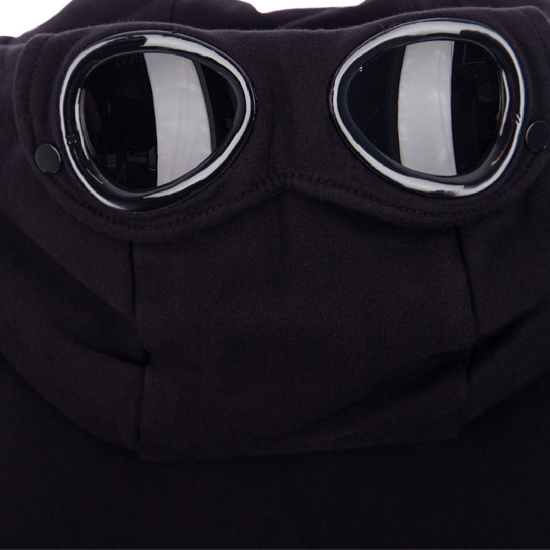 C.P. Company iconic goggle hoody featuring a full zip fastening and front pockets cut from the Italian brands' diagonal raised fleece in a navy blue colour way.