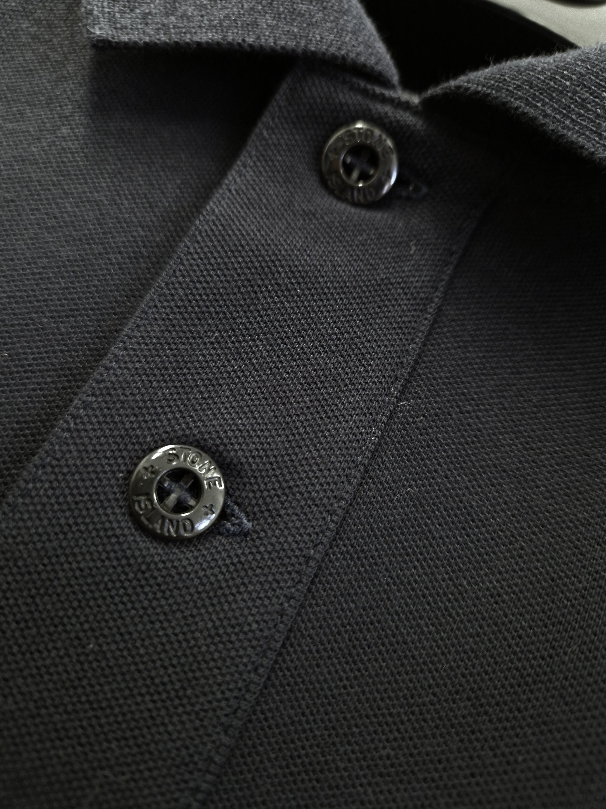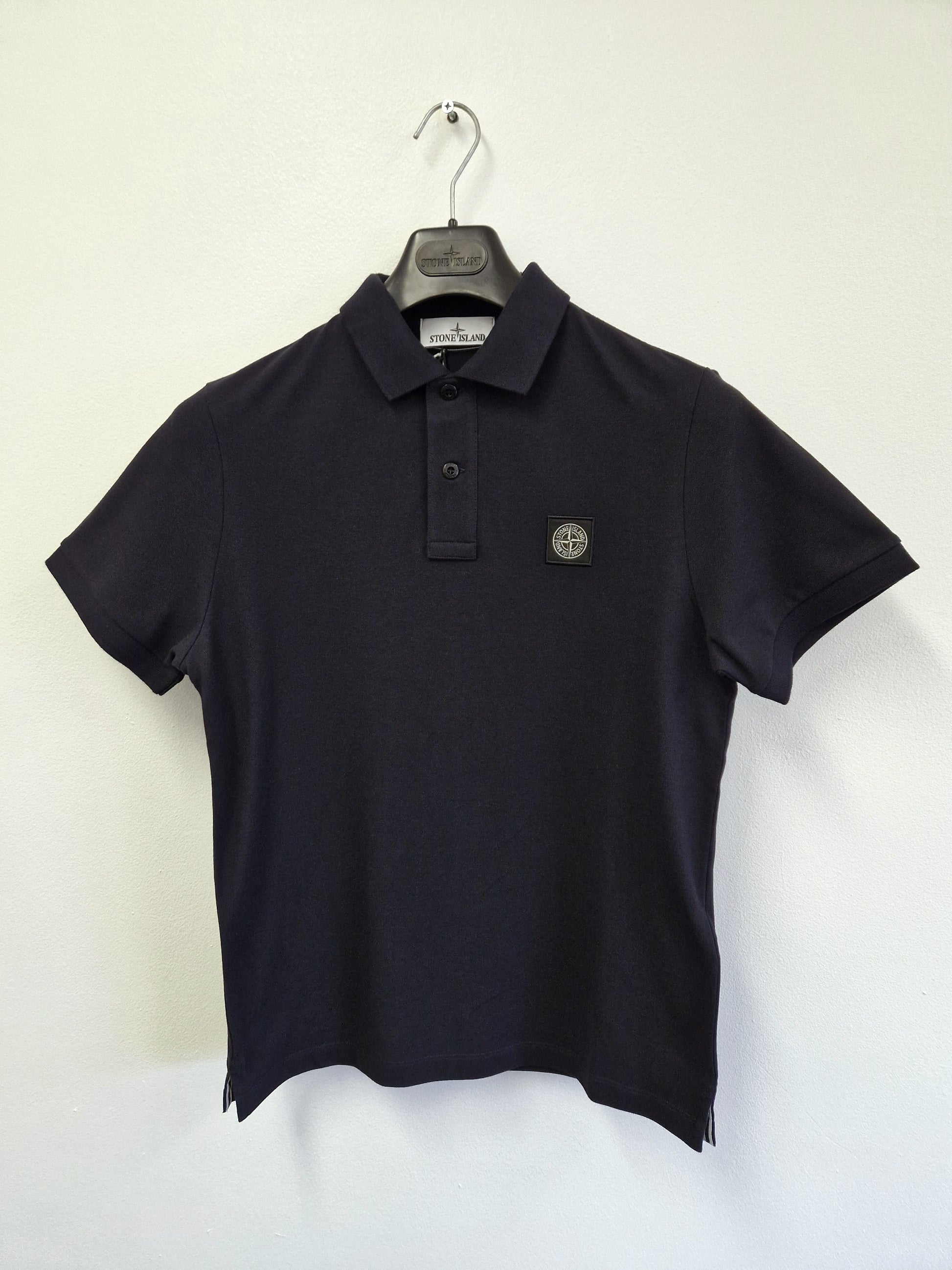 Classic short sleeve polo shirt from Stone Island featuring a two button placket and patch logo in a navy blue colour way.